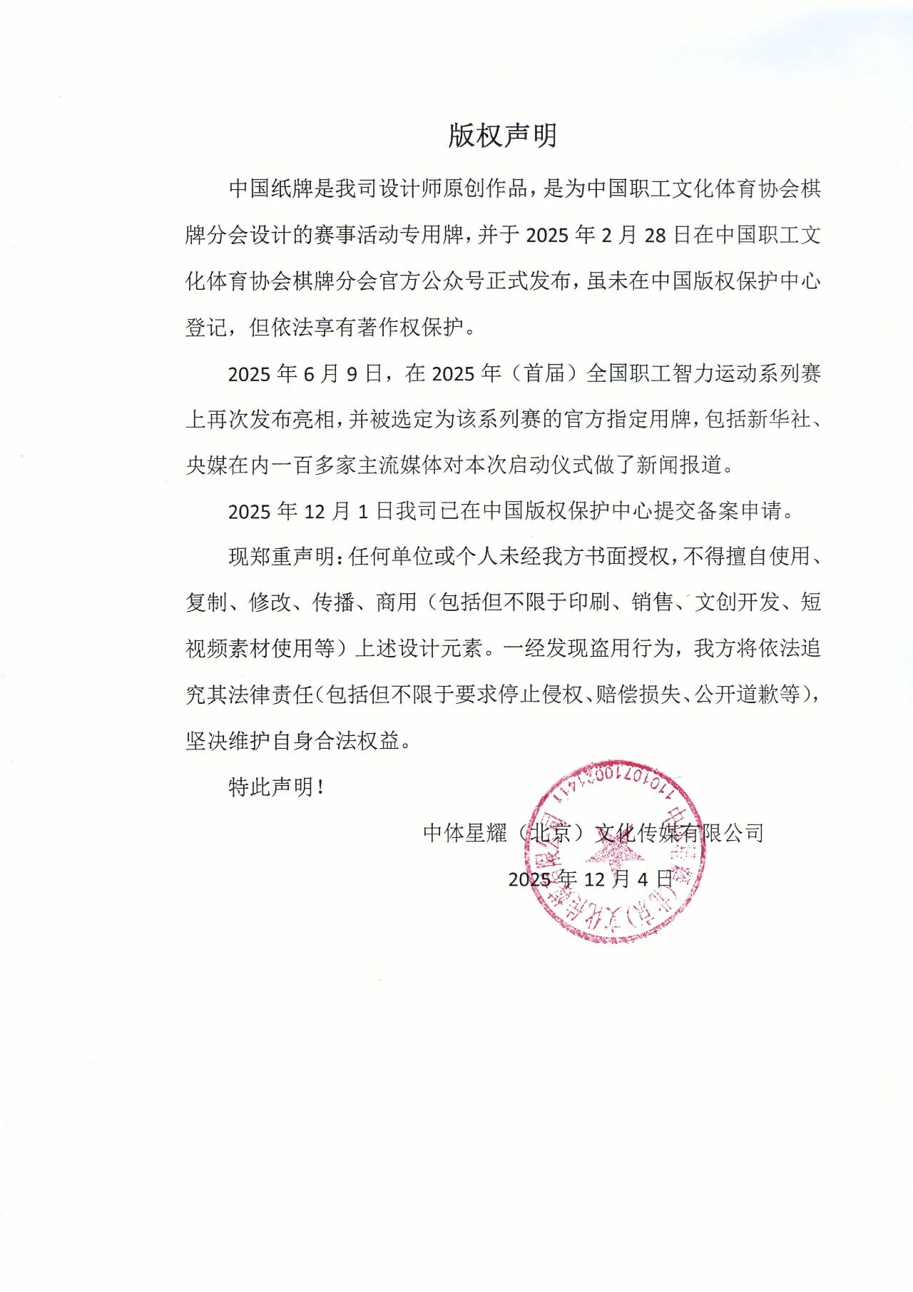 中国纸牌是我司设计师原创作品,是为中国职工文化体育协会棋牌分会设计的赛事活动专用牌,并于2025年2月28日在中国职工文化体育协会棋牌分会官方公众号正式发布,虽未在中国版权保护中心登记,但依法享有著作权保护。