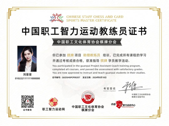 认证够权威:同样是中国职工文化体育协会棋牌分会的证,官网可查!比赛前50%拿初级教练员证,后50%拿助理教练员证,有证在手,开展教学、指导同好都更合规专业!